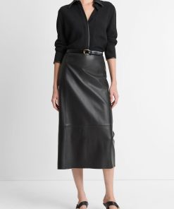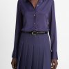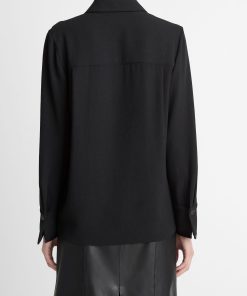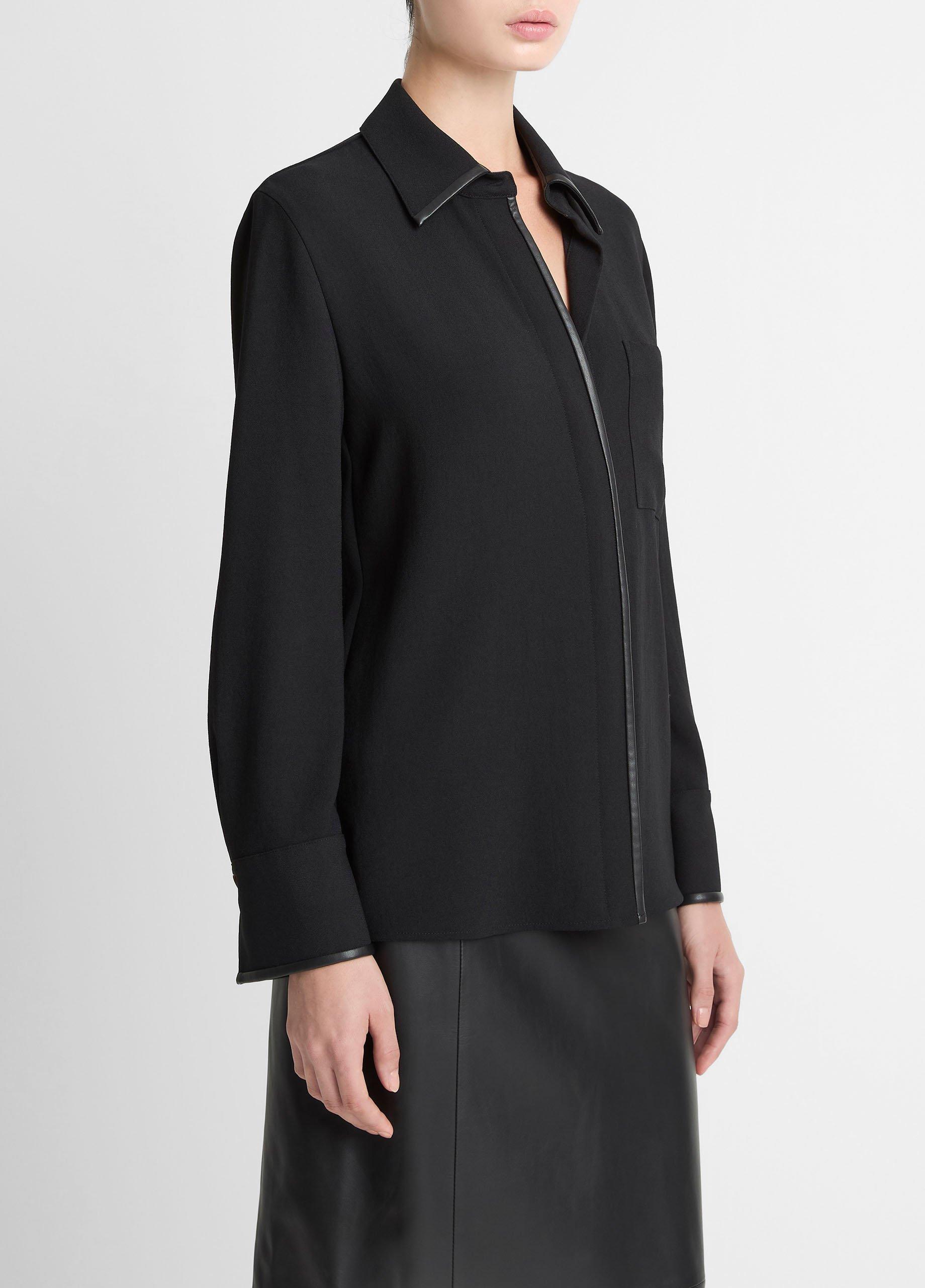 Nods to vintage car interiors pepper our lineup this fall. Spy them in the faux-leather trims that frame this matte crepe button-up. A hidden placket lends a clean finish.