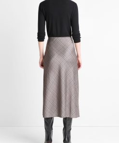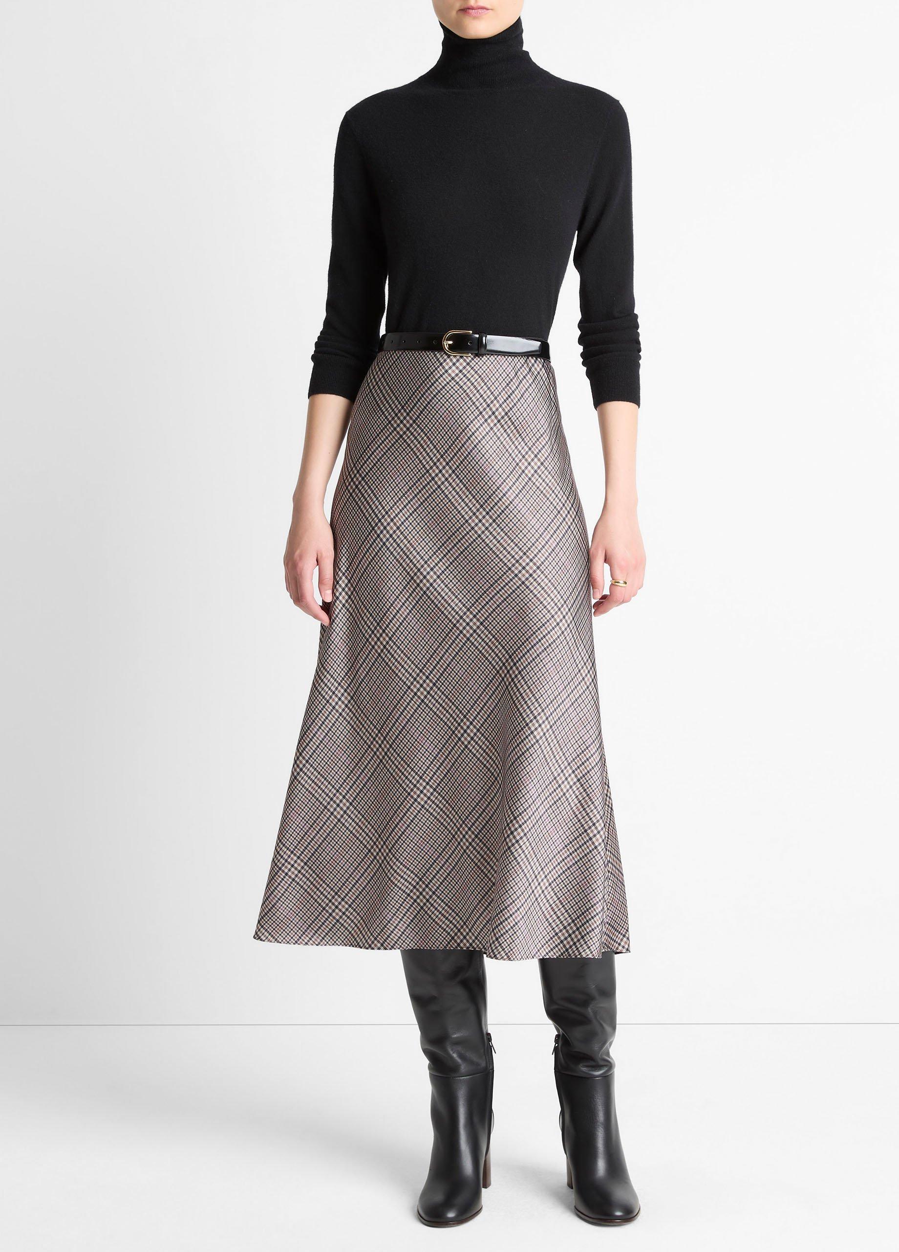 A look back at vintage cars inspired the patterns and details throughout our Fall Collection. The pressed plaid on this slip skirt is our subtle nod to those sporty interiors. This is balanced with softer touches true to the silhouette’s feminine roots, from the lustrous satin fabric to the lingerie-inspired trim at the waistband.